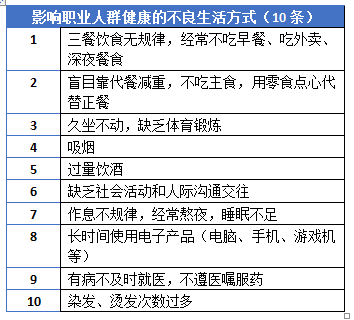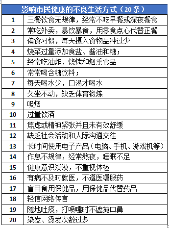 该调查后续综合投票情况,将组织专家研讨,最终确定“影响市民健康的不良生活方式”,包括一般人群存在的不良生活方式(10条)和青少年、老年人、职业人群中存在的不良生活方式(各5条),并公布社会调查结果。