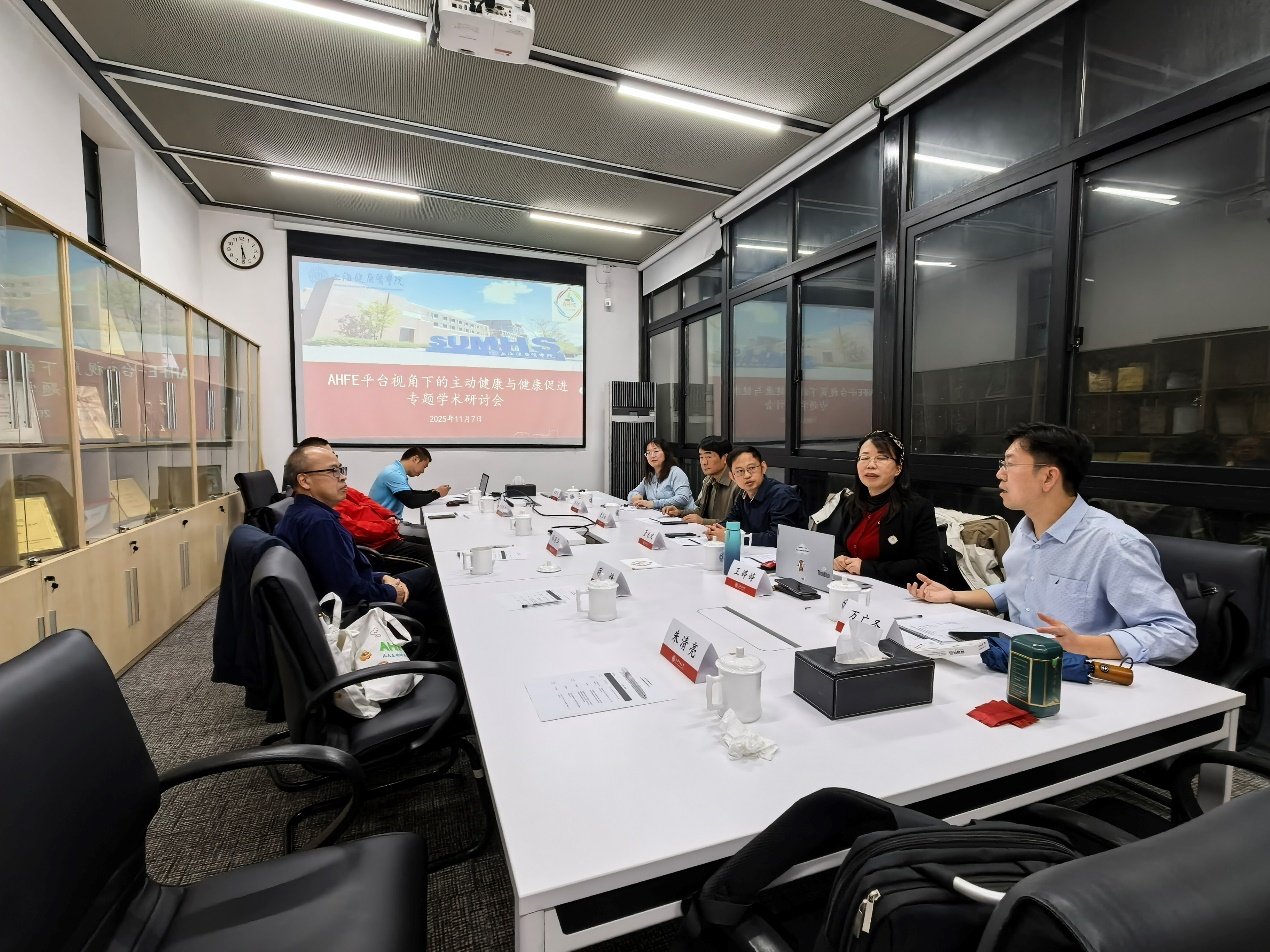 冬藏万物,智启新篇。2025年11月7日(立冬)午后,上海交通大学徐汇校区新建楼内思想火花迸发,智慧暖流涌动——以“AHFE(主动健康与健康促进协同治理平台英文缩写)平台视角下的主动健康与健康促进”为主题的学术研讨会在此举行。本次会议汇聚了来自上海健康医学院AHFE平台的万广圣教授、郑国华教授、邵晓军教授、张世翔教授、曹月柱教授等校内核心成员以及上海交通大学健康长三角研究院院长助理蒋锋教授等校外成员。大家齐聚一堂,共同探讨学校在“十五五”规划背景下,如何有效发挥平台作用,推动主动健康与健康促进领域的产教研融合与协同育人机制构建等关键议题。本次会议由郑国华教授主持。