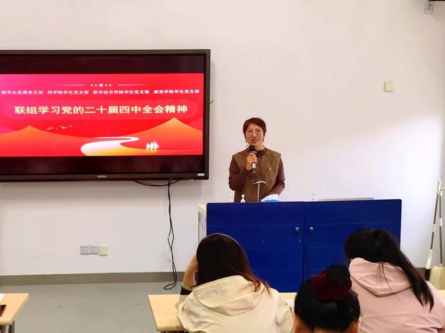 11月6日,我校研究生直属党支部、药学院学生党支部、医学技术学院学生党支部和康复学院学生党支部师生共同围绕“深入学习党的二十届四中全会精神”开展了联组学习。会议由研究生直属党支部书记蒋瑛英主持。