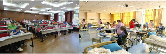 为确保考试顺利进行,学校做了充分准备。考前紧抠考试过程中的每一个细节,监控设备、人脸识别系统、考场环境布置、考试路线设计等等,每一个环节落实到人;考前一周组织了全真模拟试考,全面检验考务组织、设备运行。正式考试分为理论知识考试和操作技能考核两部分,理论考试采用闭卷笔试,操作技能考核设置4个标准化考场,考试内容包含8个案例,全面评估考生的照护能力。