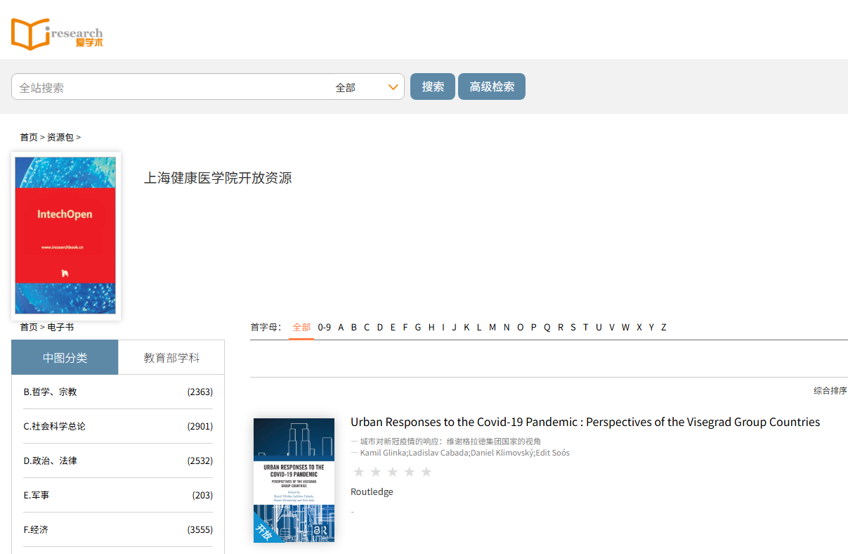 - 资源亮点:Iresearch(爱学术)是中国教育图书进出口有限公司打造的外文电子书库,旨在汇聚世界领先出版社的优质电子图书资源,为读者提供丰富的学术研究参考文献。爱学术现已为上海健康医学院开通12万余种电子书资源访问权限,涵盖:基础医学,临床医学,内外科,妇产科,儿科等全学科资源。