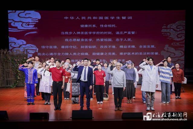 《衣被天下》不仅是一场艺术演出,更是一次面向医学生的生动思政教育。剧中通过袁满、周远航、张岚等青年学子的思想碰撞与成长蜕变,直观展现了医学教育中专业培养与人文塑造并重的重要性。当剧中人物从困惑、挣扎到感悟、坚定,领悟到“医学的真谛在于为人民的健康服务”,最终举起右手庄严宣誓“竭尽全力除人类之病痛,助健康之完美”时,台下不少师生眼含热泪,掌声经久不息。这既是对剧中人的认可,更是对自身职业初心的重温与确认。
