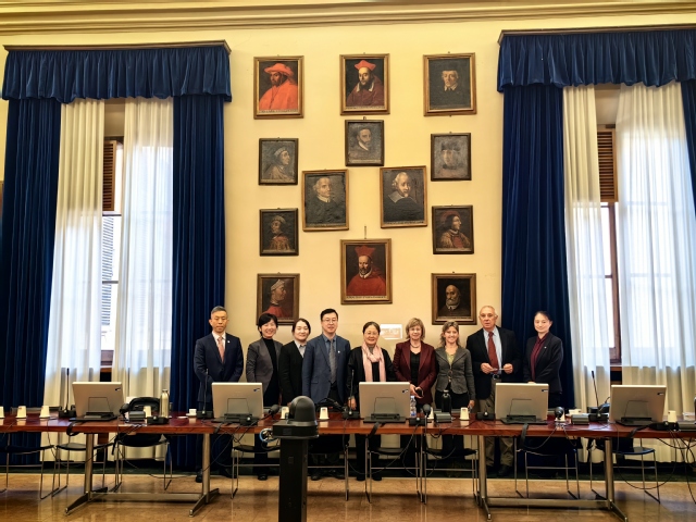 代表团首站访问意大利高等卫生研究院,与院长罗科·贝兰托内教授及多个部门负责人会谈。双方围绕食源性疾病、心血管疾病、公共卫生、老龄化照护及癌症等议题展开讨论,就加强联合培养、科研合作与师生交流达成一致。代表团还访问了意大利国家血液中心与移植中心,了解其运行模式。意大利高等卫生研究院是意大利最高国立医疗卫生科研机构,曾有4位诺贝尔奖获得者在此工作,该院广泛开展国内外教育合作与培训。