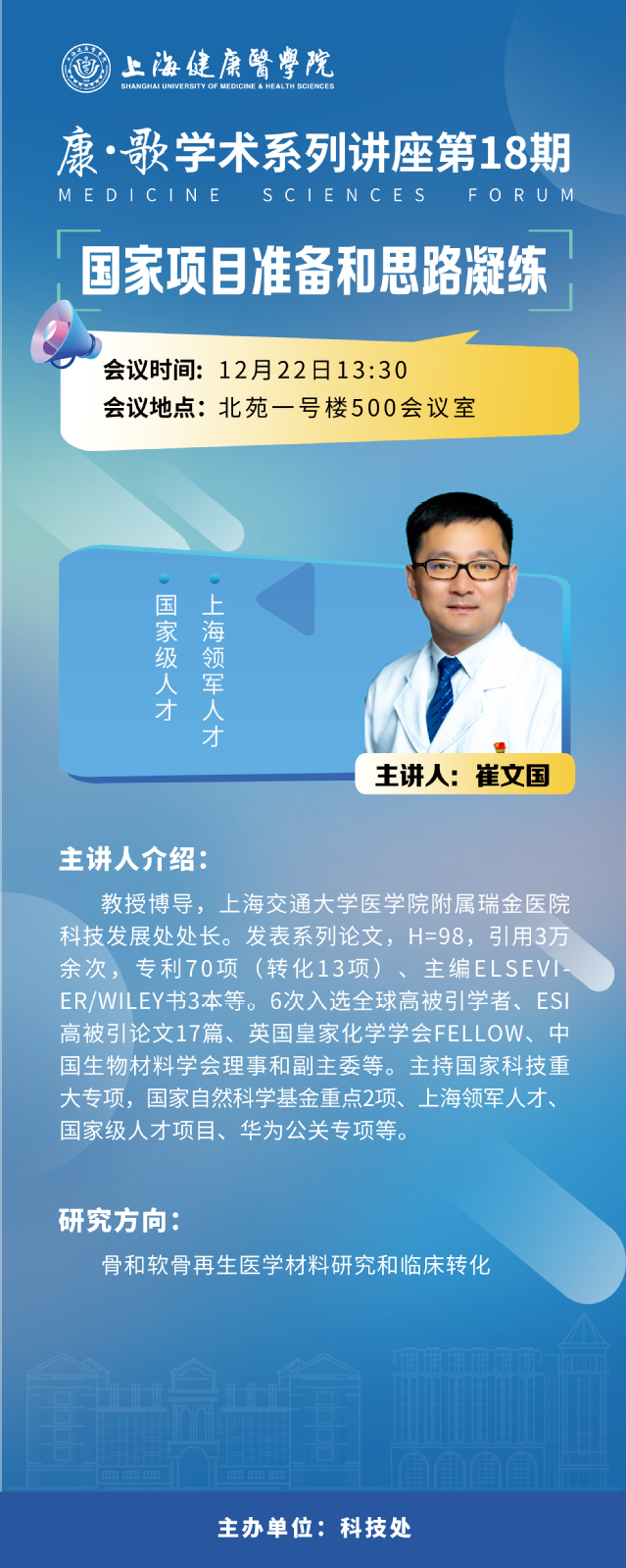 【康·歌】第18期学术系列讲座将于2025年12月22日13:30在北苑1号楼500室举办,本期特邀上海交通大学医学院附属瑞金医院科技发展处处长作主题为“国家项目准备和思路凝练”的报告。