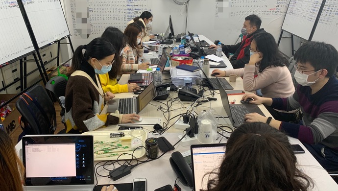 其余的视觉空间,被密密麻麻的数字、表格填满——一张张马克笔手写的表格,记录着每一例确诊患者的姓名、来沪航班、密切接触者数量等信息。不大的办公室里,十多位工作人员和志愿者围坐在长条桌旁,电脑、电话和一叠叠文件材料是每个人的“标配”。