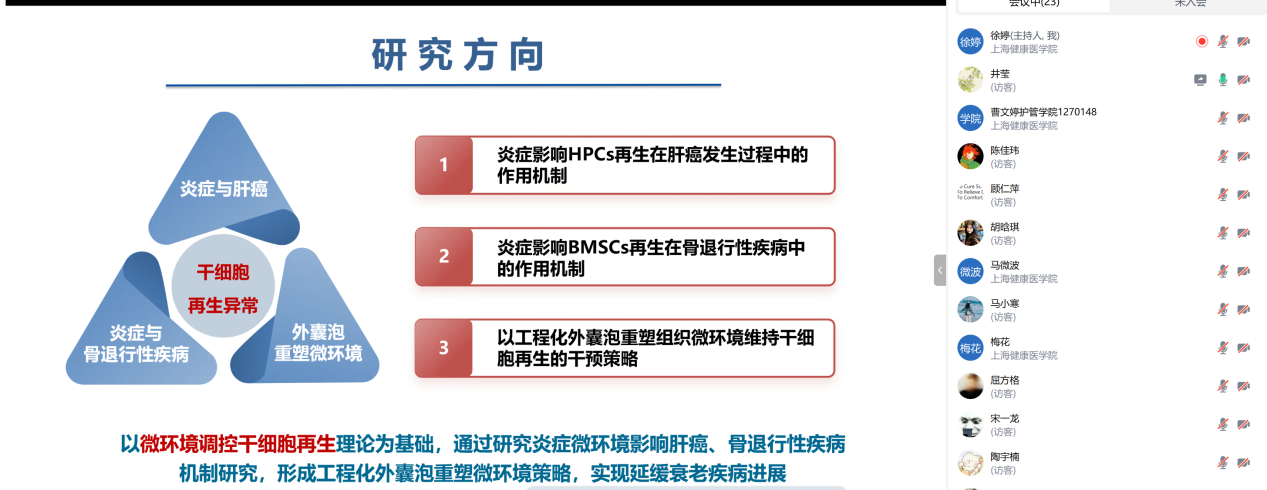 讲座中,井莹莹教授系统阐述了组织微环境紊乱与衰老相关性疾病的密切联系。她从炎症微环境对干细胞增殖分化的影响切入,深入解析了外囊泡技术在重塑微环境、延缓衰老中的前沿应用。结合其在肝癌、骨退行性疾病等方面的系列研究,井教授生动展示了基础医学机制如何为临床护理实践提供理论支撑,并特别指出工程化外囊泡在靶向治疗与规模化生产中的转化潜力。