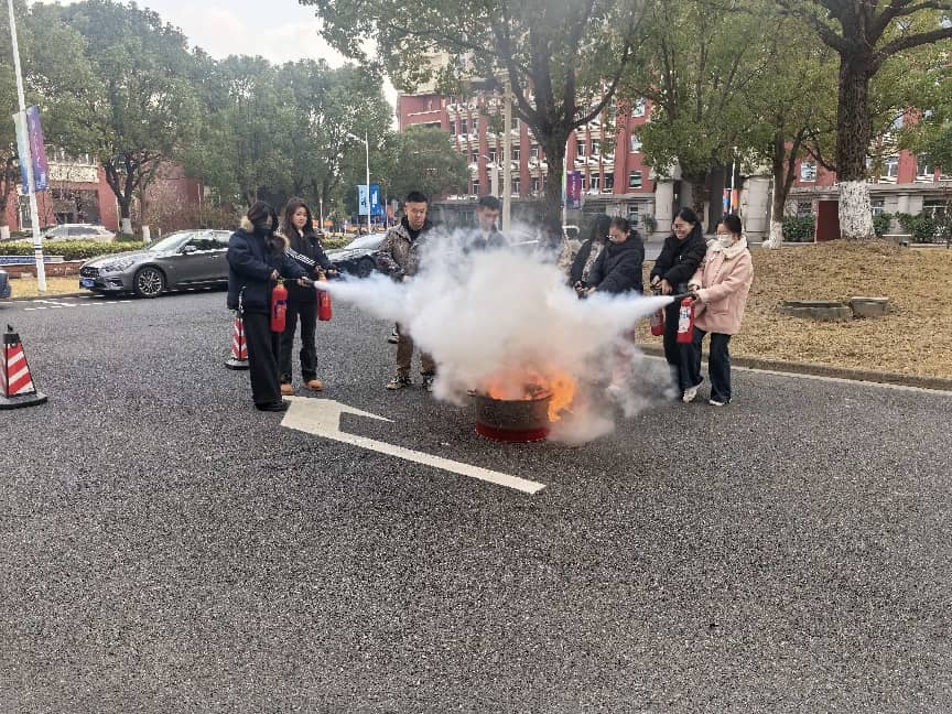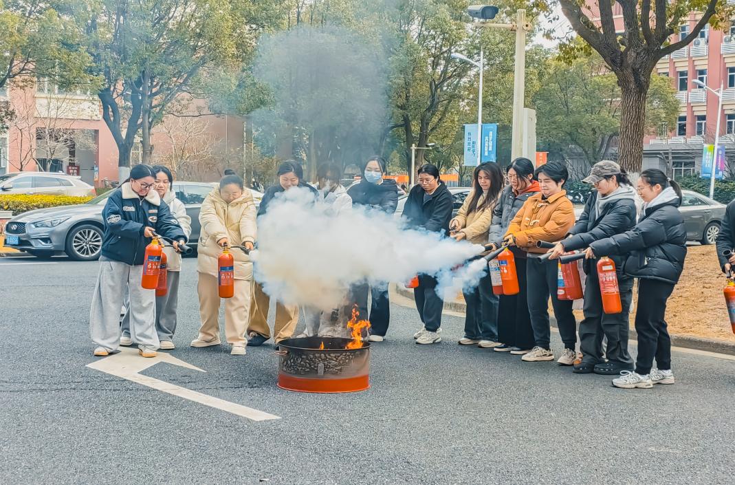 演习环节中,在学院辅导员、专任教师与保卫处老师的共同引导下,同学们迅速进入应急状态,用毛巾严密捂住口鼻,弯腰低姿沿安全通道快速有序撤离至指定集合点。集结完毕后,学院党总支副书记钱星和校保卫处宋嘉老师分别作动员讲话,重申“人人会应急”的核心宗旨,强调校园消防安全对守护师生平安、营造和谐环境的重要意义。结合元旦假期与寒假将至的时间节点,两位老师特别叮嘱全体师生,要将消防安全意识融入日常学习生活,时刻绷紧安全弦,做到防患于未然。随后,消防队员结合校园场景,围绕教学楼、宿舍等重点区域的明火隐患排查、安全用电规范展开系统讲解,细致传授险情初期处置技巧,同时着重强调火灾逃生中“沿墙行进”的关键要点。在灭火器实操训练环节,消防队员现场演示二氧化碳灭火器“辨风向、站上风口、拔保险、握喷嘴、对根部”的规范操作流程,鼓励同学们大胆尝试,同学们踊跃参与、认真实操,快速掌握了灭火器使用要领。