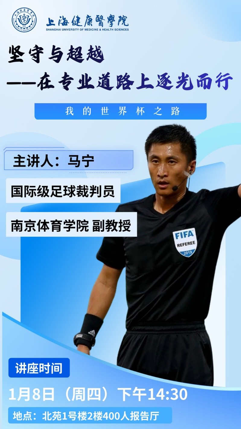 从校园足球爱好者起步,他凭借不懈坚守与专业深耕,斩获国内联赛“金哨”荣耀,更站上世界杯、亚洲杯等国际顶级赛事的执法舞台,完成了从国内精英到亚洲顶尖裁判的华丽蜕变。在执裁生涯中,马宁老师始终秉持公正执裁、直面挑战的职业态度,面对争议时坚守专业准则、勇于担当的精神品质,以及在VAR技术应用等领域的创新实践,不仅深刻诠释了体育人的初心与使命,更对青年学子的成长之路具有极强的启迪意义。