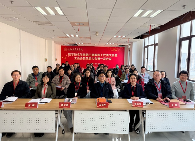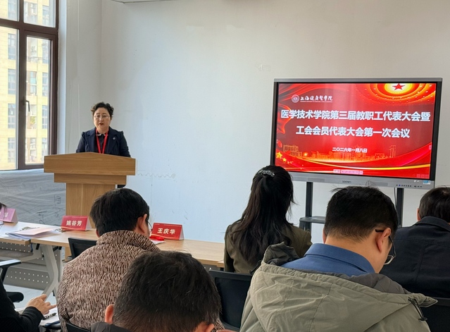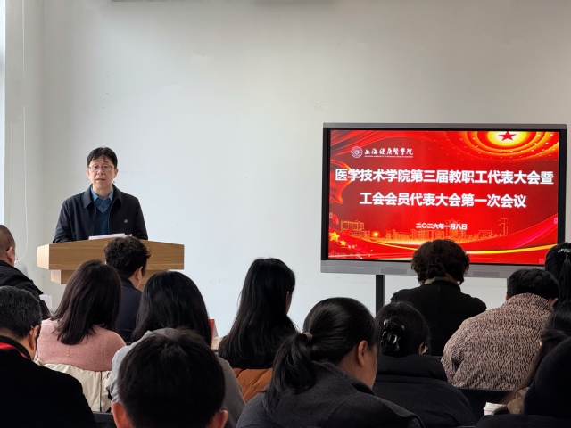 2026年1月8日中午,上海健康医学院医学技术学院第三届教职工代表大会暨工会会员代表大会第一次会议,在南苑2号楼910室隆重召开。学校党委副书记、副校长王庆华,校工会常务副主席凌文惠受邀出席大会,学院31名正式代表、特邀代表、列席代表齐聚一堂,共绘学院发展蓝图。