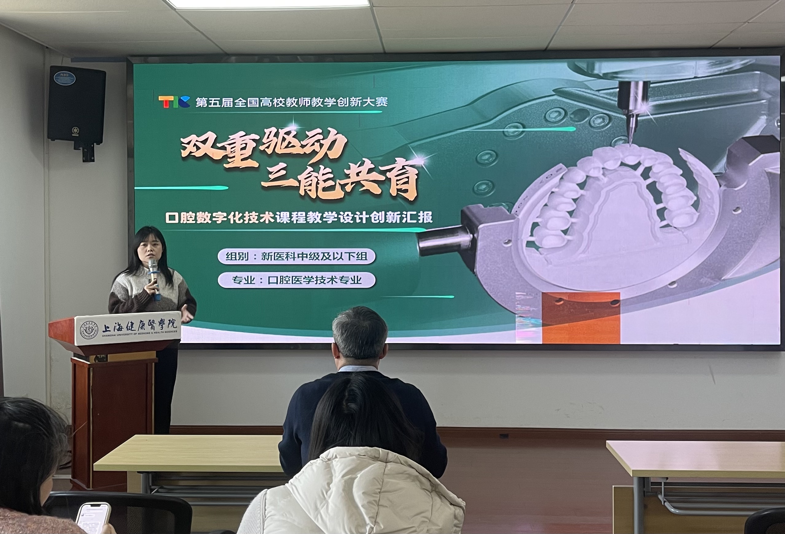 董晛老师以“经典课堂、创新课堂和数智课堂:探索和反思”为主题展开分享。分享内容分三个模块有序推进:首先进行《口腔修复学》课程的青教赛模式授课演示,讲解参赛理论授课要点,梳理竞赛备赛的核心逻辑与授课技巧;随后分享教学创新大赛课程建设的实践经验,从课程设计、痛点分析、创新途径挖掘等方面进行细致剖析;最后结合智慧课堂应用实例,展示数智技术在课堂教学中的落地场景与实际效果。董老师的分享既有理论高度,又有实践案例,同时结合参赛教师和评审专家双视角,为在场教师提供兼具实操性的备赛建议和清晰可行的实施路径。现场交流讨论氛围热烈。