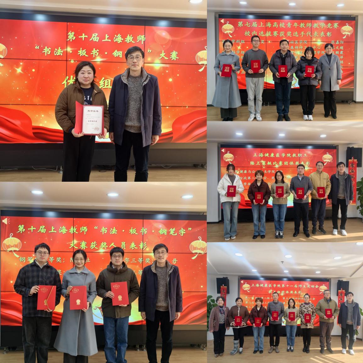 首先,教务处处长、教师教学发展中心主任王莉,工会副主席、医学影像学院院长李晓欧,工会常务副主席凌文惠为获奖人员颁奖。我校荣获第十届上海教师“书法·板书·钢笔字”大赛集体优秀组织奖、个人二等奖2人、三等奖2人;第七届上海高校青年教师教学竞赛校内选拔赛一等奖7人;上海健康医学院第十一届师生运动会教工组团体前八名;上海健康医学院教职工陆上赛艇比赛团体奖前六名。