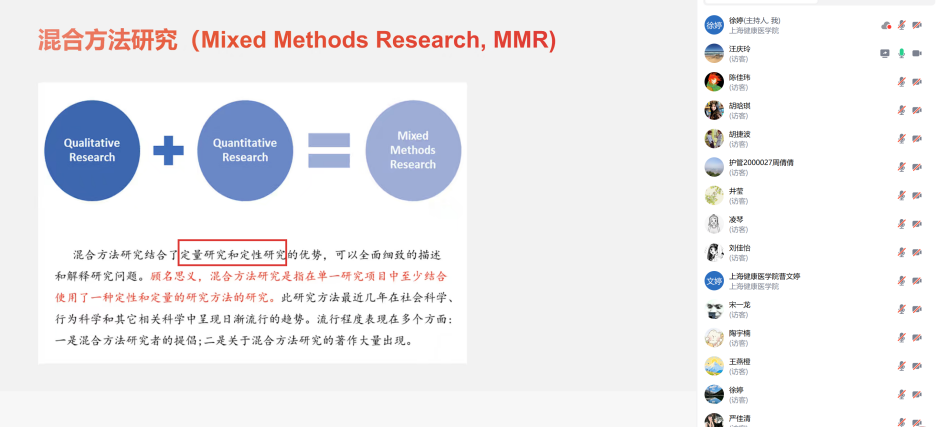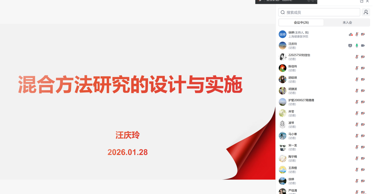 为提升师生在混合方法研究领域的研究能力与实践水平,2026年01月28日,护理与健康管理学院研究生管理办公室主办的“混合方法研究的设计与实施”线上专题讲座在学院顺利举行。本次讲座特邀学院汪庆玲副院长担任主讲嘉宾,学院院长朱爱勇教授、研究生管理办公室负责人梅花副教授、研究生导师及全体硕士研究生等30余人参与交流。讲座由徐婷副教授主持。