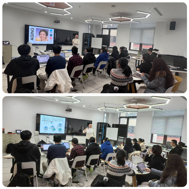 授课首日,同学们提前来到教室,迫不及待地等待上课。Galas教授以“新年是万物更新的起点,衰老是生命的过程,而科学让我们有机会更健康、更优雅地老去。”作为开场白,他巧妙地将节日的“辞旧迎新”与课程的“解码生命”结合起来,让原本对学术和语言双重紧张的同学们瞬间放松起来。师生在笑声中开启“解码抗衰老”的学习。