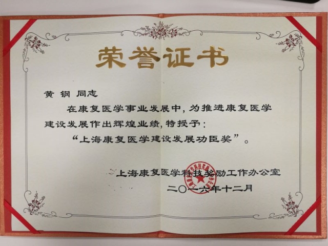 我校校长黄钢教授,因在着力提升康复人才培养质量,全面推进康复医学教育事业,创新驱动上海康复医学建设发展方面的巨大成就,获得由上海康复医学科技奖励委员会评选的“上海康复医学建设发展功臣奖”。