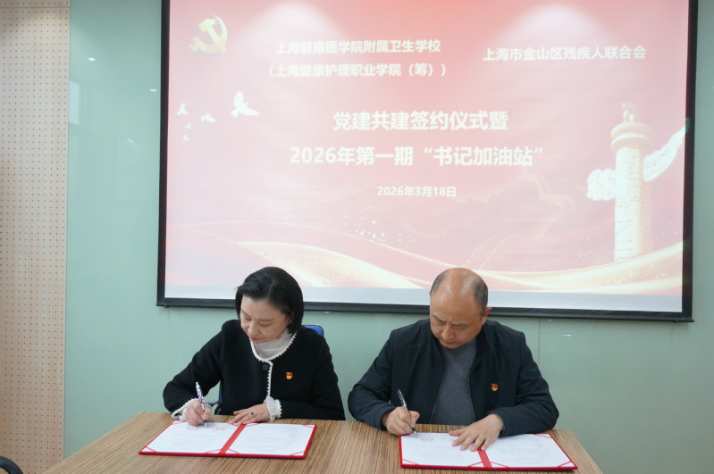3月18日下午,上海健康医学院附属卫生学校(上海健康护理职业学院(筹))与金山区残疾人联合会党建共建签约仪式暨2026年第一期“书记加油站”,在金山区朱泾镇阳光家园举行。学校以深入开展树立和践行正确政绩观学习教育为契机,以“党建红”引领“志愿红”,推动学习成果转化为助残实效。金山区残疾人联合会副理事长金新弟、学校党总支书记钱艳、副书记臧圆圆、金山分校校长程晓钰,学校各党支部书记及双方党员代表参会,仪式由党总支宣传委员蔡辰年主持。