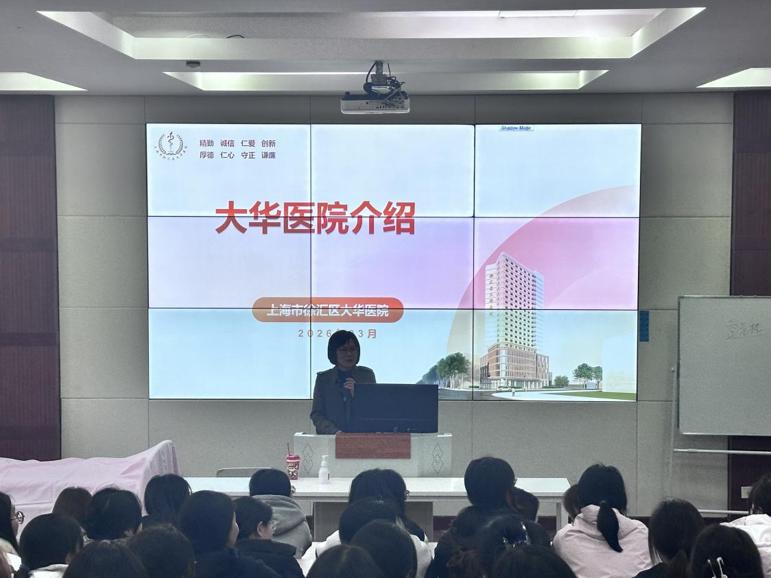 为深化产教融合与校院协同育人,精准对接医疗护理行业人才需求,搭建护理高职学子优质临床实践平台,2026年3月26日,上海市徐汇区大华医院与护理与健康管理学院在北苑9号楼104教室联合举办实习专场宣讲会。大华医院王懿主任、彭春敏老师,学院教学办教师与高职学生共同参加了本次活动