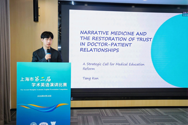 外语教学部立足服务学校四大领域专业培养目标,深入开展学情分析,优化分层分类教学改革方案,聚焦学生学术发展需求开展个性化指导,精准助力学生提升学术英语应用能力。两位参赛同学的演讲内容,均源自外语教学部特色课程的教学与研究成果。岑择同学以《On the Construction of a Public Cognitive Framework for Food Metabolism by Producing Short Video on Popular Science(科普短视频视角下食物代谢公众认知框架的构建路径研究)》为题,深入展示了科普短视频在构建食物代谢公众认知框架中的实践探索;唐堃同学则以《Narrative Medicine and the Restoration of Trust in Doctor-Patient Relationships: A Call for Medical Education Reform(叙事医学助力医患信任重建:基于医学教育改革的路径研究)》为题,重点探讨了叙事医学在重建医患信任、推动医学教育改革中的重要意义。这两篇演讲分别依托阮俊斌教师团队开设的《健康科普翻译与创意写作》、《叙事医学平行病历(例)翻译与写作》两门特色课程,是在通用《学术英语 - 医学》课程基础上的深化与拓展,充分体现了英语教学与医学专业知识的深度融合。