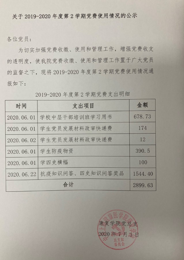 康复学院2019-2020第二学期党费使用公示