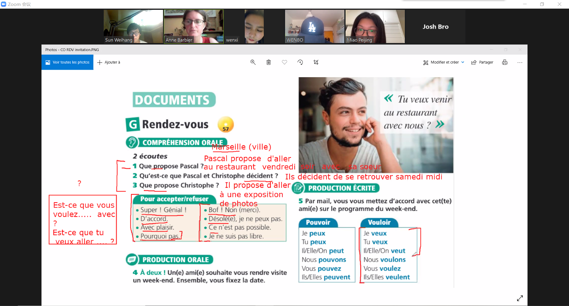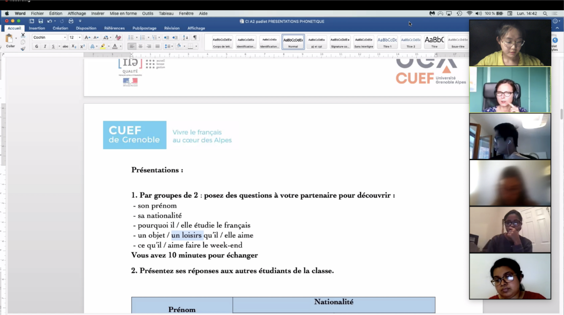 首先是因材施教,实行国际化小班教学。CUEF实行分阶授课,入学时,老师们通过远程一对一分班测试后,将同学们根据法语水平分成A1-B1班级,每个班级不超过10人。为了加强学生的国际化体验,分班时,有意将来自世界各地的同学分在一个班级。但不同的国家时差,又平添了选择适合每一个学生教学时间的烦恼。但老师们怀着极大耐心,与每个学生沟通,多方积极配合协调,最终将课程确定为中国时间20:30-21:30;20:30-22:00(法国时间14:30-15:30; 14:30-16:00)。