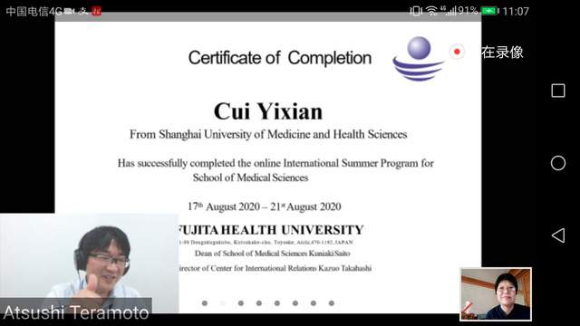 结营仪式上,双方师生依依惜别,期待下次再见。藤田医科大学给营员们颁发了修学证明。本次线上夏令营活动进一步增进了双方的了解,有效推动了双方在医学影像技术领域的国际交流与合作。(医学影像学院、国际交流处)