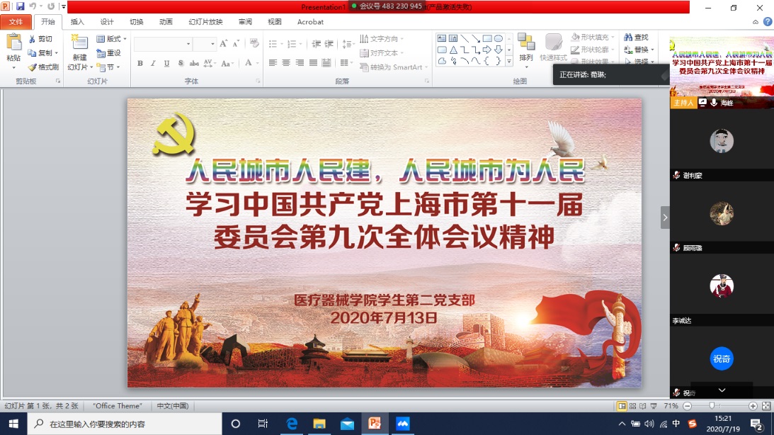 2020年7月13日,医疗器械学院学生第二党支部通过腾讯会议平台学习中国共产党上海市第十一届委员会第九次全体会议精神。此次学习由王海峰同志主持,祝奇、荀琳、李若洋、原亮以及学生党员共计19人参加了学习。