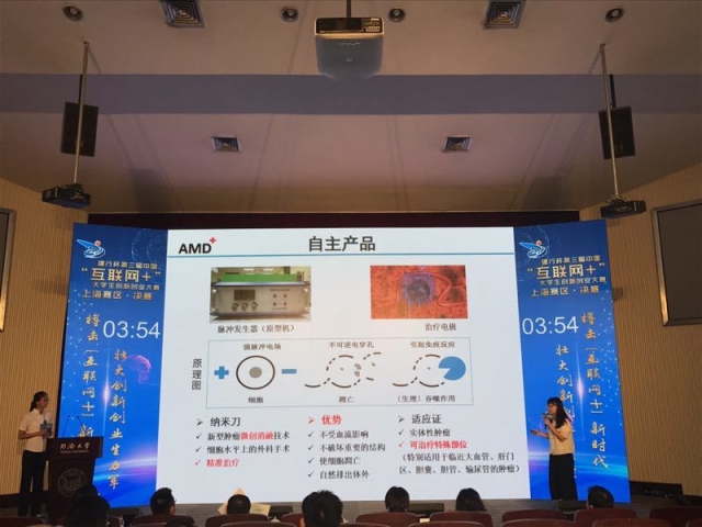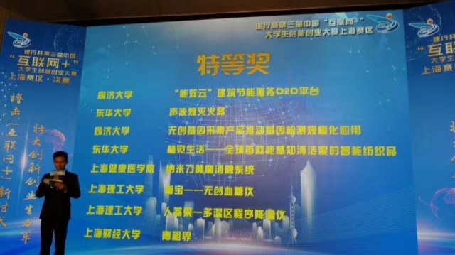本届大赛自4月启动以来,共吸引了70余所高校、科研院所的近15000余人次报名参赛,参赛项目作品数3500余件。7月9日,本届“互联网+”大赛上海赛区复赛在同济大学举行,包括同济大学、复旦大学、上海交通大学、华东师范大学、上海大学、上海理工大学、上海财经大学、东华大学、上海健康医学院等13所高校的24件作品从3500余件作品中突围,进入决赛。经过激烈角逐,“能效云”建筑节能服务O2O平台等8件作品获评特等奖,星墨——炫酷的环保型金粉彩色墨水等16件作品获评一等奖。我校参赛项目——纳米刀肿瘤消融系统,顺利通过复赛,并在决赛中夺得了“特等奖”的好成绩,入围九月份在西安举行的全国总决赛。