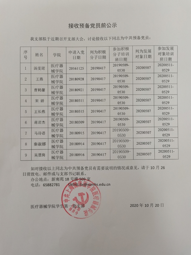 医疗器械学院学生第一党支部 2020年下半年接收预备党员前公示
