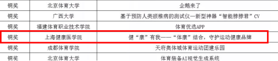 2019年11月,体育教学部“健康有我,体康结合——守护运动健康品牌”项目以华东赛区一等奖的成绩出线,原本将在2020年5月于天津举办的决赛由于疫情原因改为10月24日-25日在线上举行。参加此次决赛的有来自北京体育大学、同济大学、天津体育学院、浙江师范大学、郑州大学等127所高校,共142支参赛队伍,1000余名参赛选手,对总决赛的金奖、银奖、铜奖三个奖项展开激烈角逐。