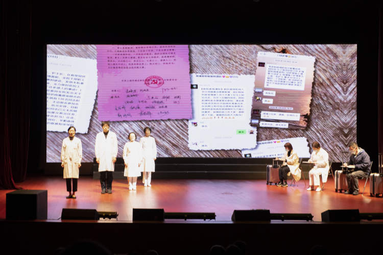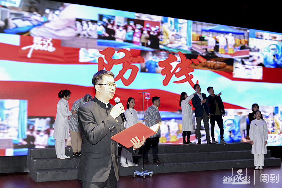 根据周浦医院抗击新冠肺炎的真实经历创作的原创抗疫朗诵剧《防线》今天在上海健康医学院上演。