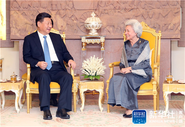 2016年10月13日,习近平在金边看望柬埔寨太后莫尼列。莫尼列太后特意请习近平在西哈努克太皇生前常坐的椅子上就座。新华社记者 姚大伟 摄
