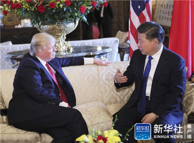 2017年4月6日,习近平在美国佛罗里达州海湖庄园同美国总统特朗普举行中美元首会晤。新华社记者 兰红光 摄