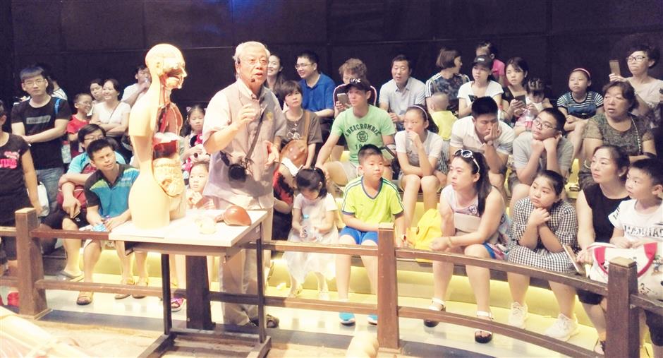 Sporting a green volunteer waistcoat, this former lecturer at the Shanghai University of Medicine and Health Sciences spends a day at each museum every week, explaining the structure of the human body and health-related issues to curious visitors in popular half-hour lectures.