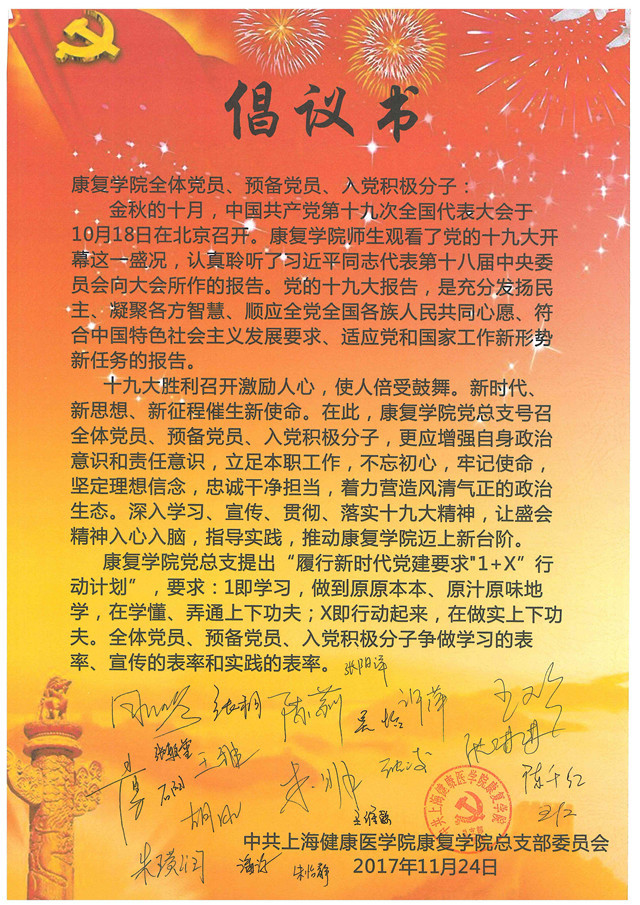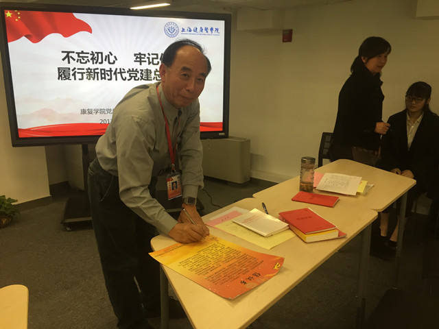 在组织学习前,康复学院领导班子高度重视,专题讨论如何落实学校下达的学习要求,制订了“履行新时代党建要求的‘1+X’行动计划”,1即学习,做到原原本本、原汁原味地学,在学懂、弄通上下功夫;X即行动起来,在做实上下功夫。学院领导带头学习,每人都分工落实十九大报告、中国共产党党章、十九大纪委工作报告等的学习、交流和考核,组织专题座谈会、课程思政交流会,推进学习效果,制订工作内容、学习形式、时间和主持人的实施方案。