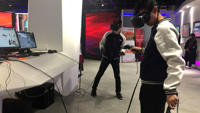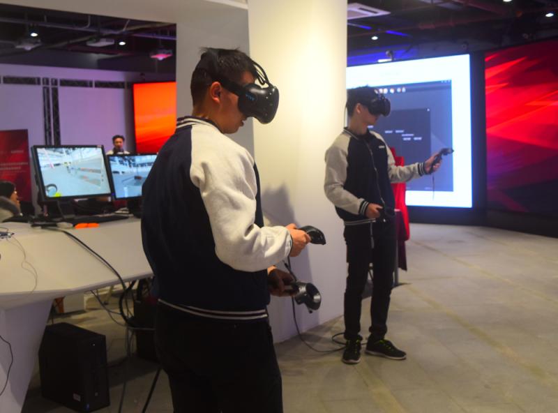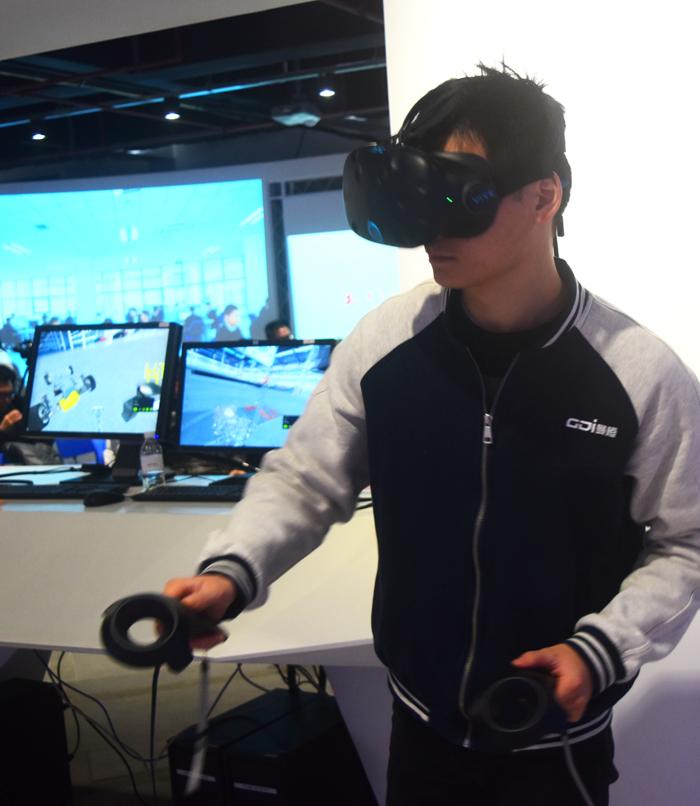 今天(7日)下午,上海工程技术大学松江校区,来自汽车学院的研二学生雷朝凯走进了艺术楼,和小张同学分别戴上VR头盔,拿上交互手柄,一下子就“跳”进了电脑屏幕里,“跳”进了1000平方米的上海大众汽车厂房里。在新启用的VR综合实验中心,他俩不是欣赏艺术,也不是来打游戏,而是在此上了一节新能源汽车底盘结构课程。目前,沪上一批高校课堂正先期引入“虚拟现实”的VR课,为教学提质增效。