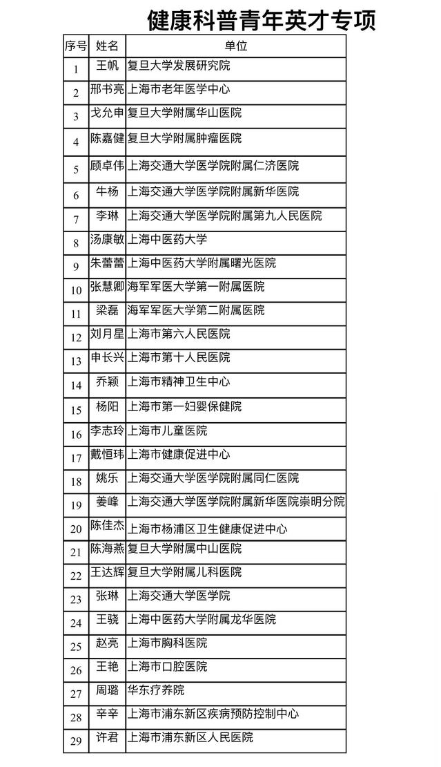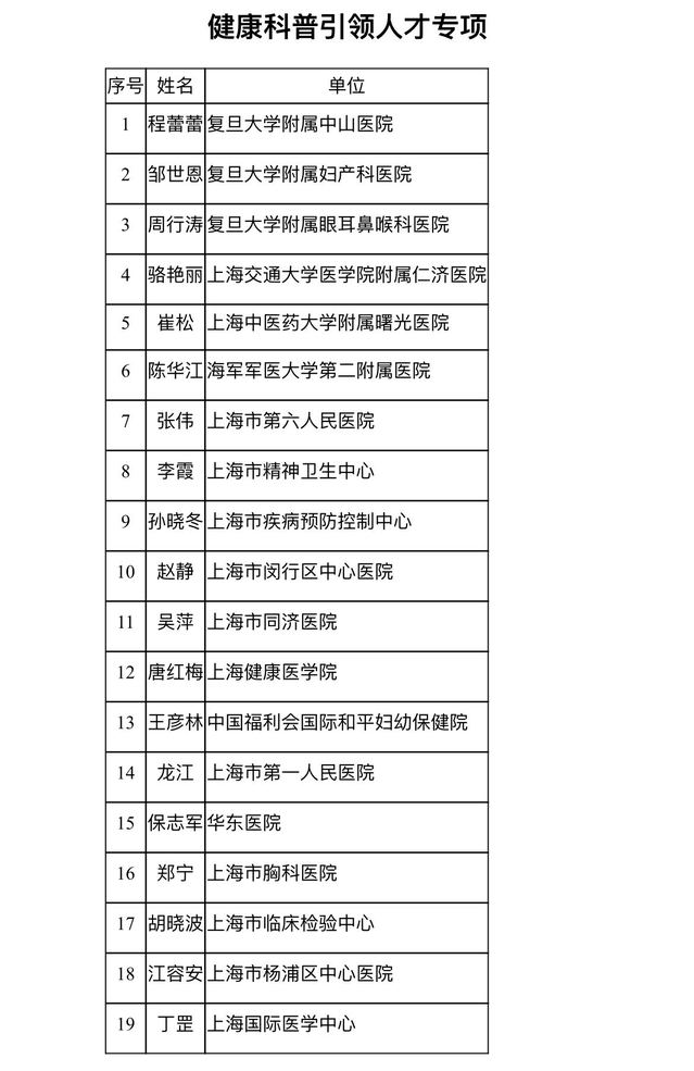 今天,记者从上海市卫生健康委、市健康促进委员会办公室获悉,本市率先在全国推出有财政经费支持的健康科普人才能力提升专项,旨在大力培育健康科普高端人才与青年英才。目前首轮上海市健康科普人才能力提升专项名单正式发布,周行涛、崔松、程蕾蕾、邹世恩、孙晓冬、赵静等19人从成千上万名医务人员中脱颖而出,获得健康科普引领人才专项;戈允申、顾卓伟、乔颖、李志玲、戴恒玮、姚乐等29人,获得健康科普青年英才专项。