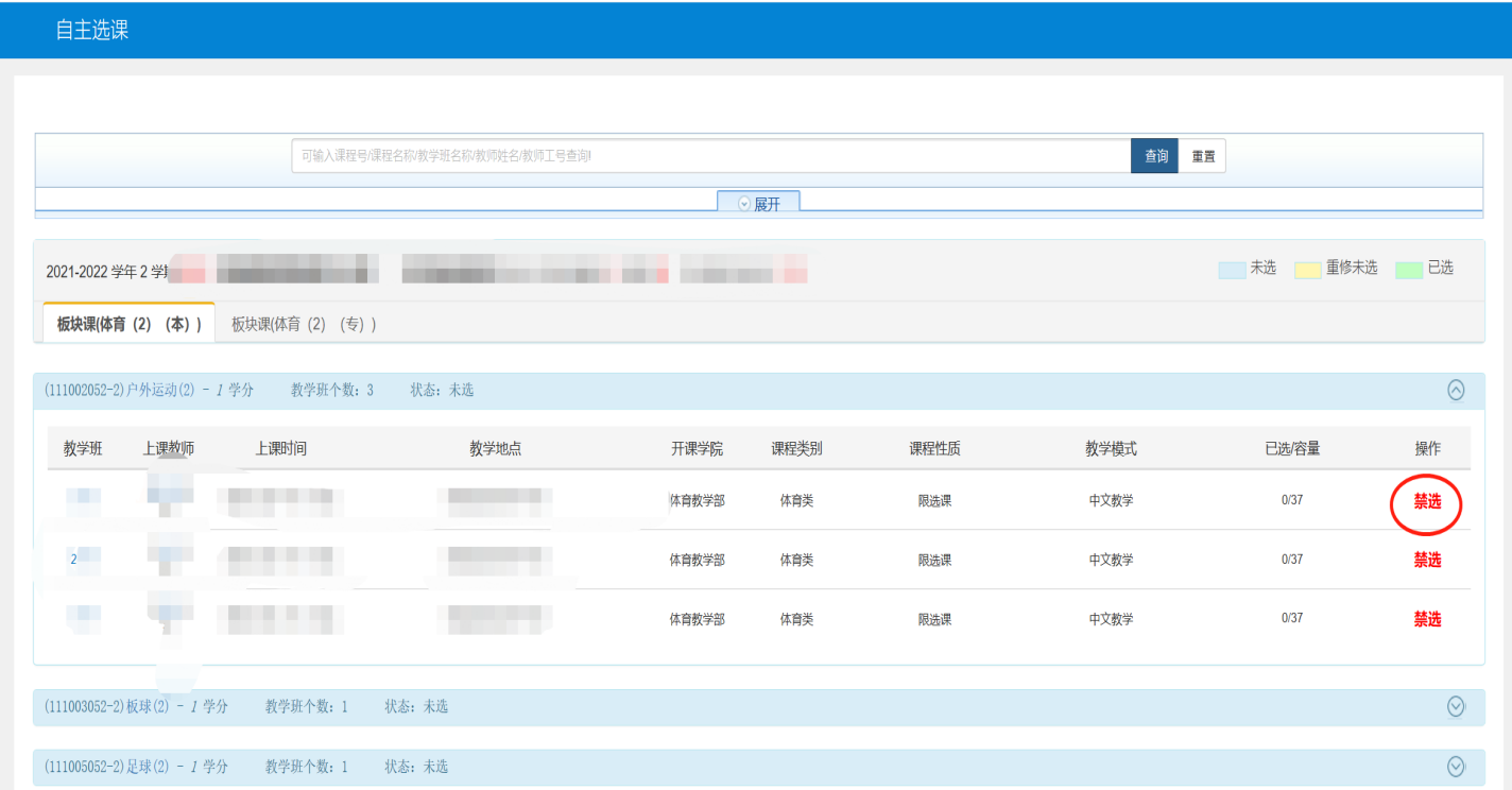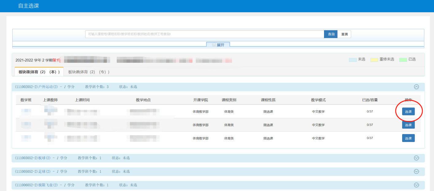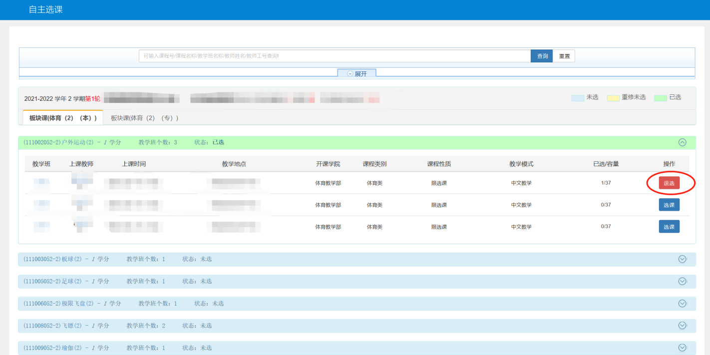 2.每位同学每学期限选1门体育俱乐部课程。选课为抢选制,每个时间段俱乐部课程先选先得,额满为止。课完成后若需退课重选,可在选课时间范围内退课,超过选课时间一般不得退选、改选。