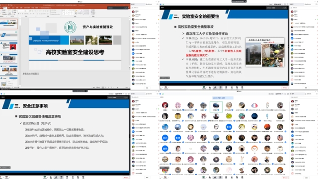 下午1点30分,资产与设备管理处开展“实验室安全月安全专家进校园系列讲座”第二场名为《高校实验室安全建设思考》的线上培训,特邀上海师范大学资产与实验室管理处池春荣处长来进行宣讲,此次讲座吸引全校400余名师生。池春荣从实验室安全的理论、实验室安全的重要性、实验室安全的注意事项、实验室的应急处置、实验室的习惯养成等五个方面,通过举例近年来典型高校实验室安全事故,详细分析事故原因,强调了细节决定安全的理念,具体为我校师生详细讲解了实验室防爆、用电、用气、防毒、仪器设备安全以及灭火器选择、化学品的应急处置的实用防护应急操作,大大提高我校师生的实验室安全防护实操能力和安全隐患应急处置能力,建立必备的安全防患意识。