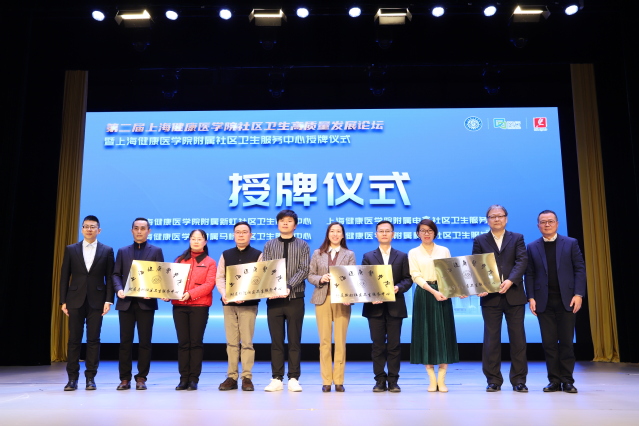 仪式上,闵行区卫健委主任杭文权与我校产学合作处处长张苏华共同为马桥、梅陇、新虹、申鑫等4所社区卫生服务中心授牌。