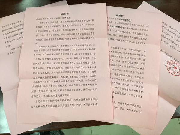 大华医院写信感谢药学院志愿者细致服务