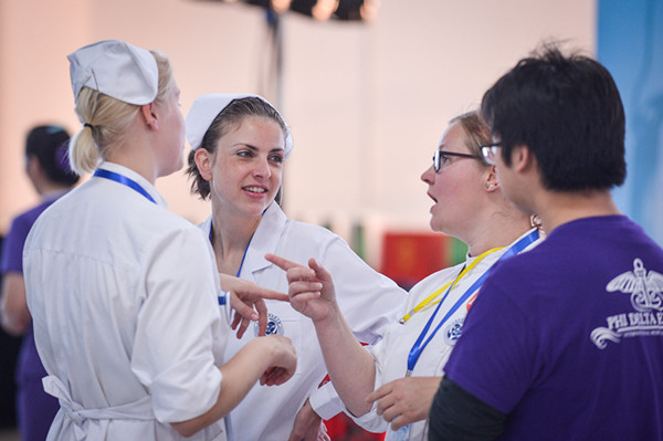 为了培养国际化护理人才,搭建医学院校与医院及国外同行的交流平台,2015上海国际护理技能大赛于今日(11月7日)在上海健康医学院举办。来自8个国家和地区的包括美国、加拿大、挪威、芬兰、荷兰等国及本市 20 所医院、12所学校的40支参赛队和80名选手参加比赛。在比赛现场,所有“标准病人”都由资深的护理专家担任,参赛选手必须以全英语的方式与他们交流。这些“挑剔的病人”通过模拟医院里可能出现的任何场景,随机考察选手是否具备真才实学。文汇报记者 陈龙 摄影报道