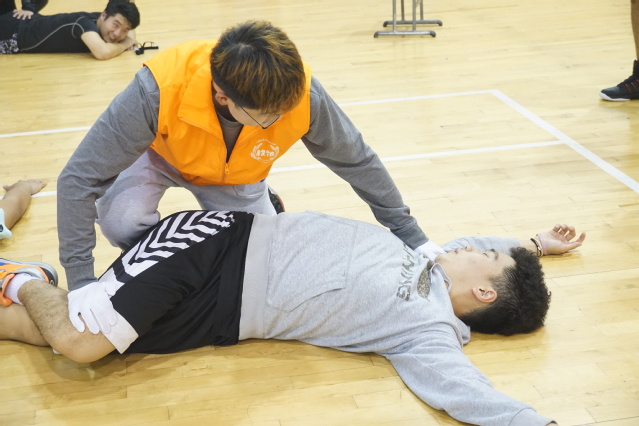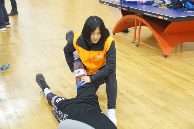 我院赛后牵伸志愿者服务队由王佳有和黄倩赟同作为领队派出12名成员穿上鲜亮活力的院志愿者服,步入篮球场助力运动员们放松肌肉痉挛、缓解疼痛等。针对篮球赛的项目特点,悦康赛后牵伸志愿者服务队的同学们重点对运动员的股四头肌、腘绳肌、小腿三头肌等进行牵伸。同时,教他们如何自行适当的进行自我牵拉肌肉放松。
