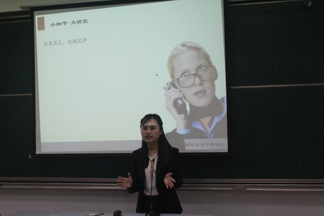 临床医学院团总支书记徐婷老师首先为学员们带来了《小细节大讲究》。徐婷老师绘声绘色地从声音——未见其人,先闻其声,形象——保持自然,扬长避短,体态——学会微笑,展现内心三个方面,结合学生日常学习及生活情况,客观讲述了教养体现细节,细节体现素质的道理,告诉学员们要通过细节维护个人及集体形象。通过情景模拟告诉学员们要把“小细节大讲究”的工作态度落实到日常的团学工作中。