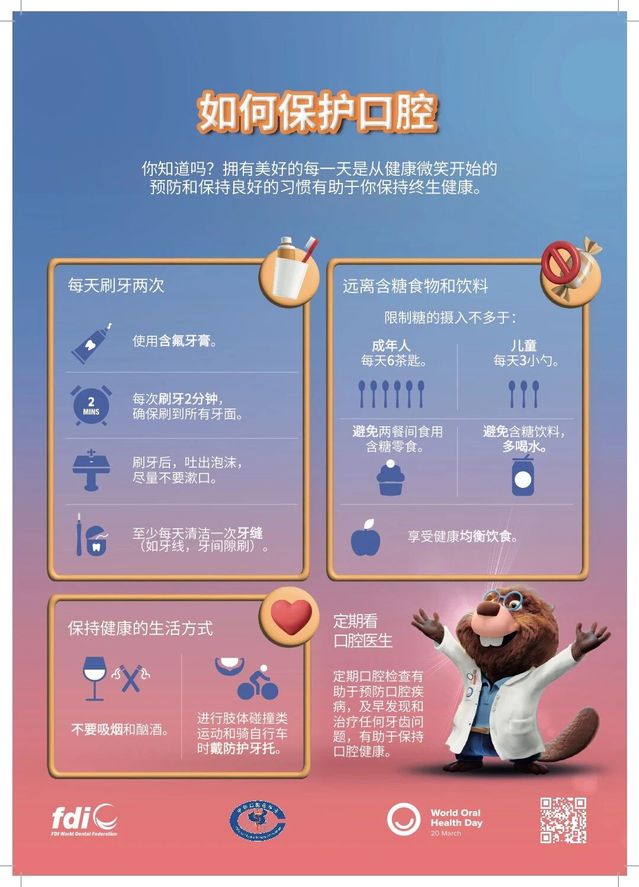 每年3月20日是世界口腔健康日,今年的主题为“健康口腔 幸福生活”。该国际日由世界牙科联盟(FDI)发起,旨在提升全球公众的口腔健康素养,倡导科学护齿理念,促进口腔健康与全身健康的协同发展。“320”这组数字承载着明确的健康愿景:儿童期拥有20颗健康的乳牙,成年后拥有32颗恒牙,至80岁时仍能保留20颗有功能的天然牙。