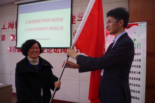 12月5日,护理学院大学生文明自查队授旗仪式在浦东校区北苑完成。护理学院党总支、护理学院负责人,以及各辅导员受邀参加本次仪式。