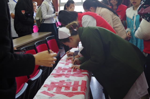 护理学院党总支书记方秀琴为学院大学生文明自查队进行授旗。自律部部长沈承雨代表自查队诸位同学来接受方秀琴老师的授旗。在护理学院学生会自律部部长沈承雨的号召下同学们纷纷在横幅下签下自己的名字,以表示自己的决心。