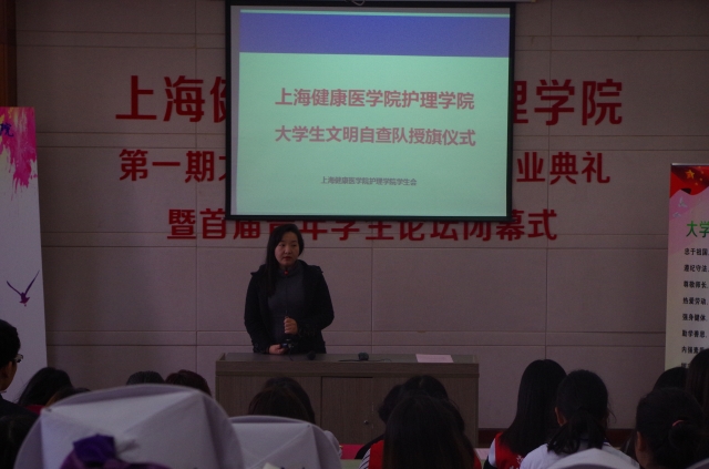 仪式开始之前由学生会会长赵思沁为同学们宣读大学生文明公约,让同学们在仪式开始前能够先体会到此次仪式的宗旨与主题。护理学院党总支副书记薛文正讲话,她指出,文明礼仪的修养是每个学生从内到外的自身修养。作为学生干部要将文明行为准则体现到工作中,承担起应有的社会责任。