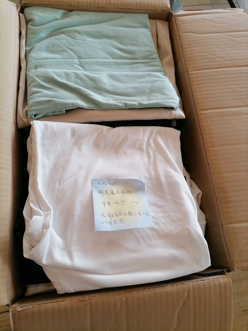 “现在天气逐渐热了起来,我们大学生都难以忍受这种被汗滴浸透的感觉,而叔叔阿姨们长期待在食堂闷热的环境中,他们生活和精神都面临着压力。” 2020级药学(高职)2班李东青同学趁着天气晴好,赶紧清洗了两件短袖送到食堂,“希望叔叔阿姨能穿着我的衣服开心工作,温馨入眠。”