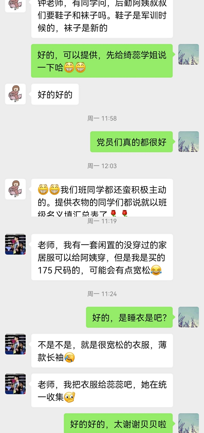 这两天,王海峰、钟旭芬带着药学院学生党员邱绮蕊、章倩倩、臧煜翔,以及作为党员发展对象的李东青4位学生代表,将整理好的衣物送到了食堂阿姨手中,她们感动得眼睛都湿润了。“谢谢孩子们,在这个时候能够得到你们的帮助,我们心里暖暖的。”王阿姨心里抑制不住激动地说。