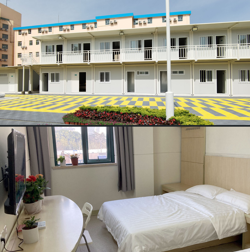 徐汇区龙耀路方舱的外景(上)与内景(下)(3月16日摄)