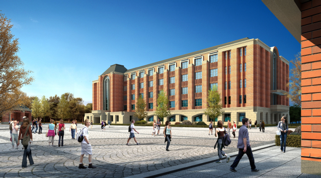 整个东苑校区秉承“两轴一环+工字布局”的规划架构,其方正的校区规划宣示了上海健康医学院所包含的医护关怀,展现了学科融合与交流创新的实践性校园文化。建筑风格和色彩元素呼应学校现有的三个校区特色,采用浅黄色真石漆基座、红色面砖主体和蓝灰色瓦屋面的色彩组合,延续竖向三段式的古典立面手法,以古典风格在整体上的对称工整体现医学的严谨,用古典风格在细节上的韵律变奏体现医学的人文关怀。